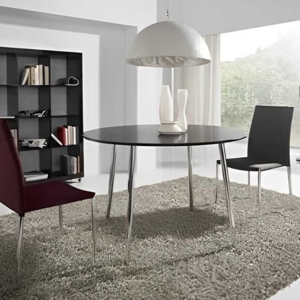Mesa redonda fabricada con una tapa de DM lacada en color mate con 4 patas metálicas cromadas redondas. Diametro de la pata 38 mm, de acero de 1,2 mm. Medidas: diametro del tablero de 110 cm x alto 75 cm