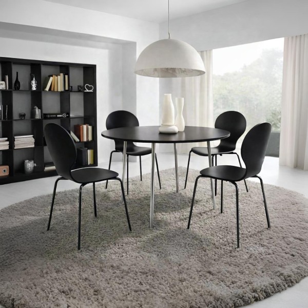 Conjunto de cuatro sillas Color Negro Materiales: - Estructura de contrachapado, espesor 4,3 cm - Pies de acero cromo Dimensiones: 48 x 52 cm Altura: 86 cm - Diámetro del pie: 16 mm