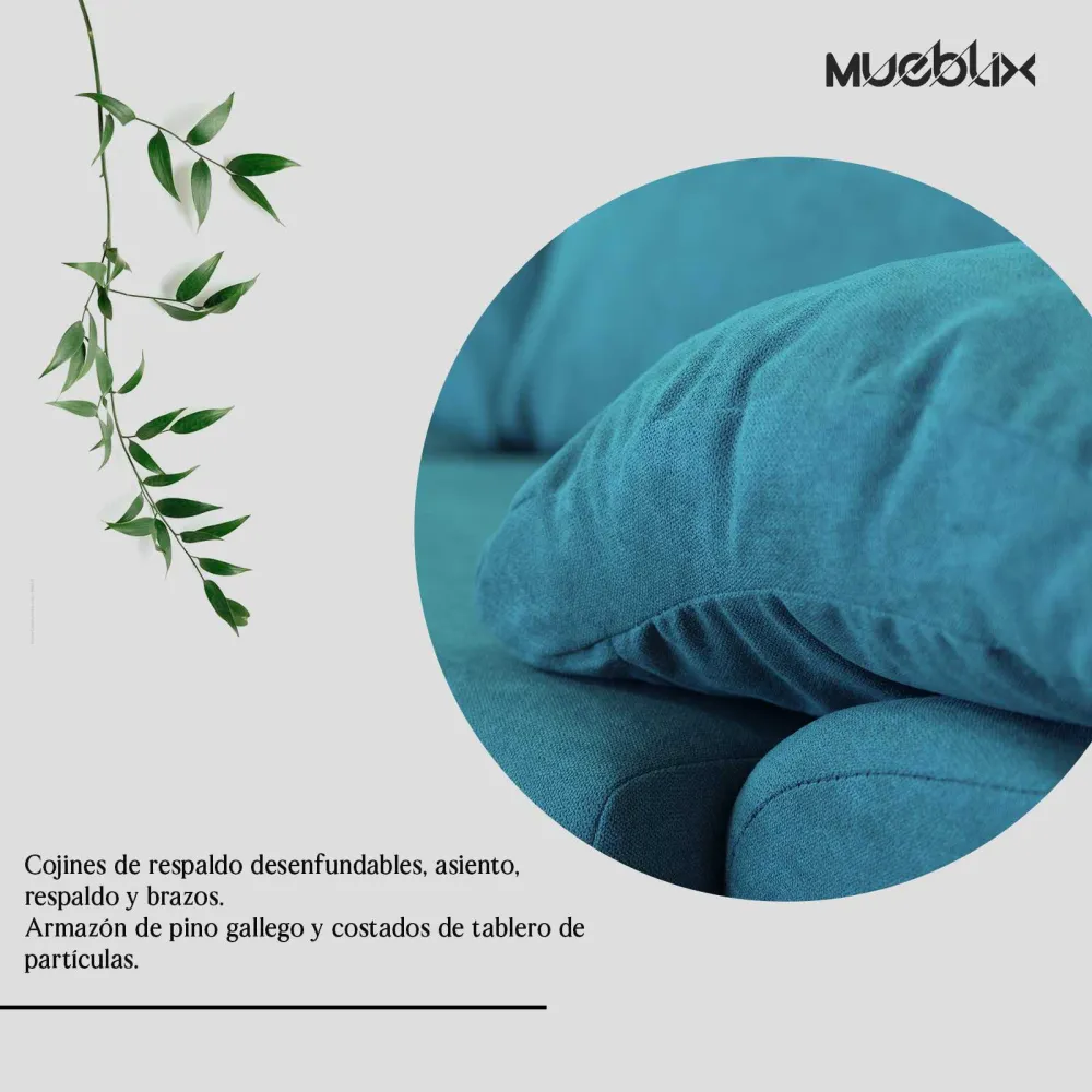 Cojines de respaldo desenfundables, asiento, respaldo y brazos Armazón de pino gallego y costados de tablero de partículas Bastidor con mecanismo antideslizante con cincha tipo nea Respaldos en mezcla de fibra y goma espuma picada Asientos de goma espuma de densidad 25 kgs recubierto de fibra