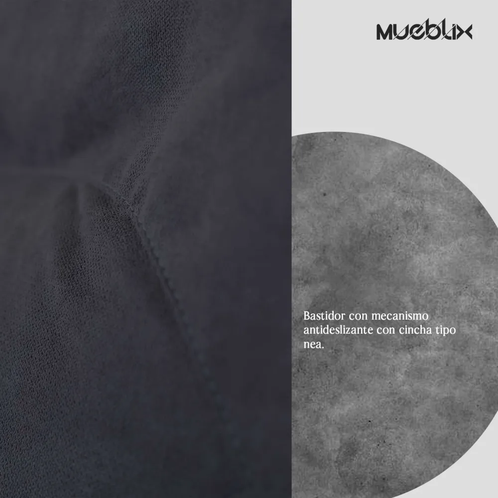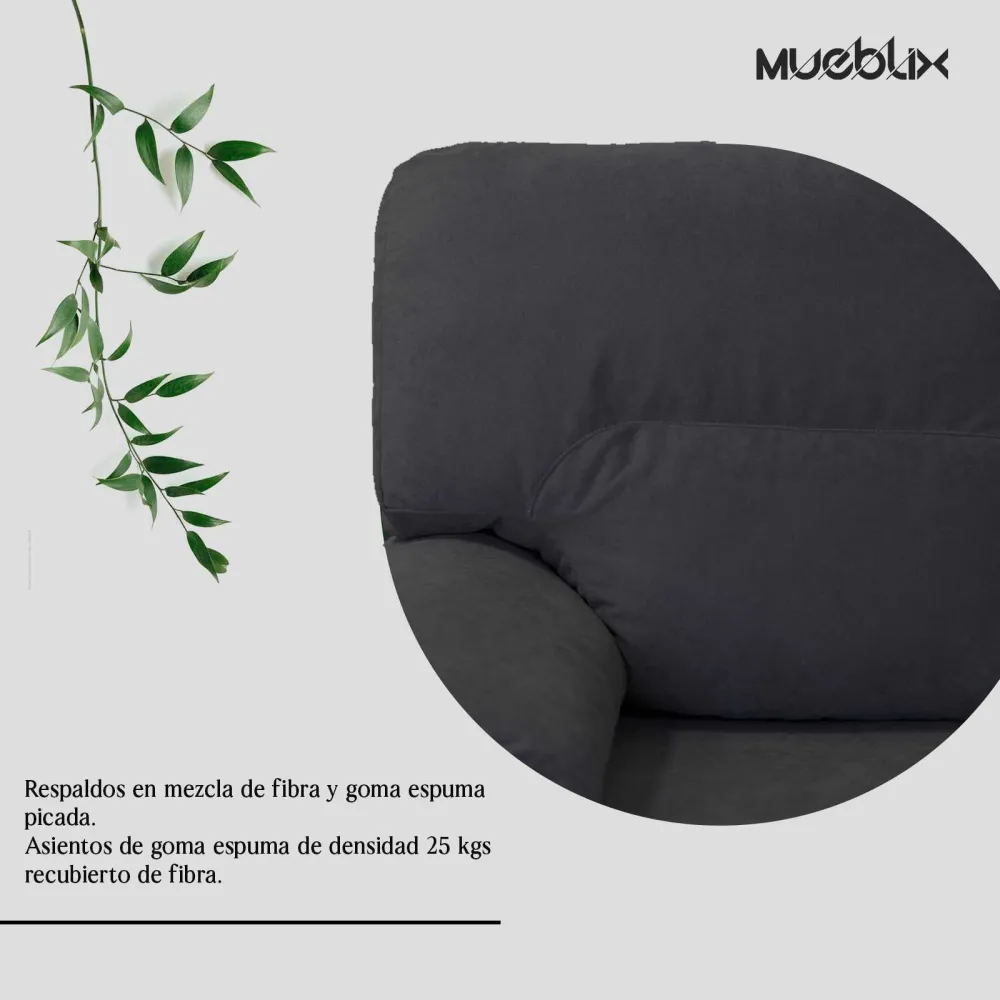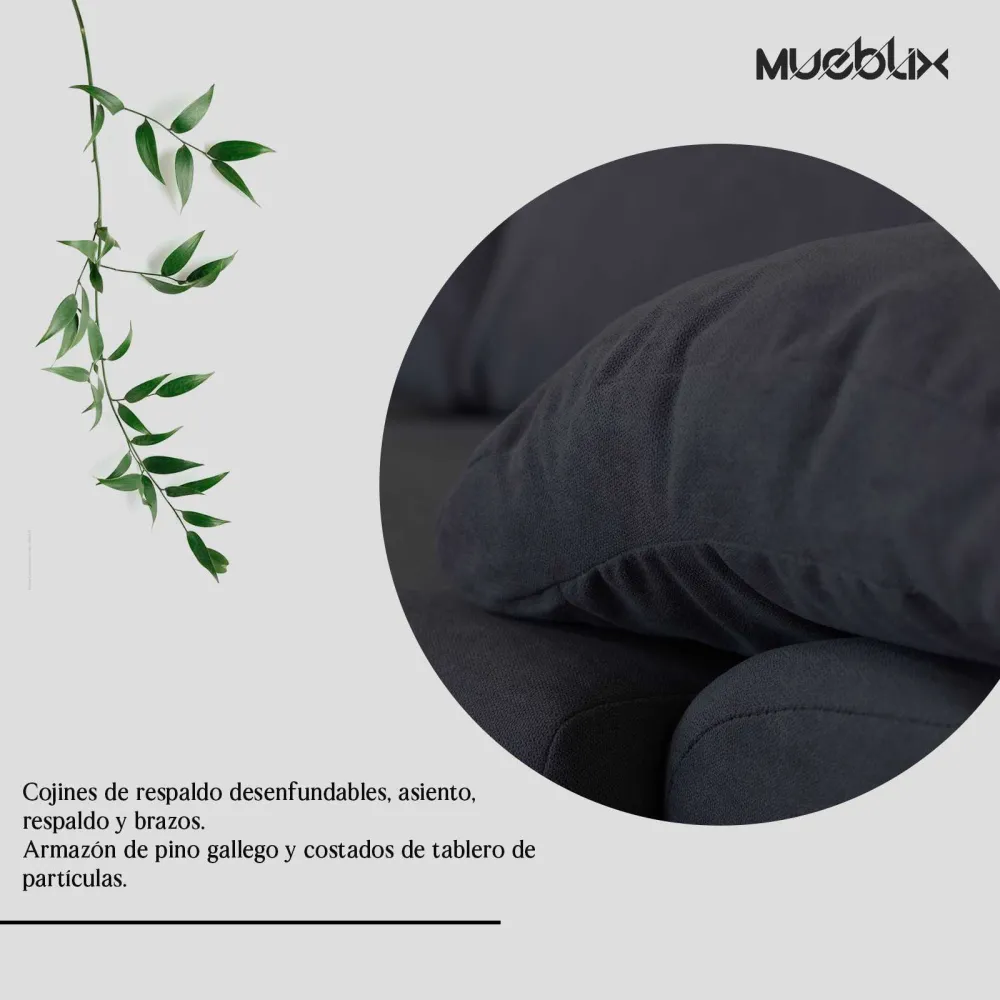 Cojines de respaldo desenfundables, asiento, respaldo y brazos Armazón de pino gallego y costados de tablero de partículas Bastidor con mecanismo antideslizante con cincha tipo nea Respaldos en mezcla de fibra y goma espuma picada Asientos de goma espuma de densidad 25 kgs recubierto de fibra